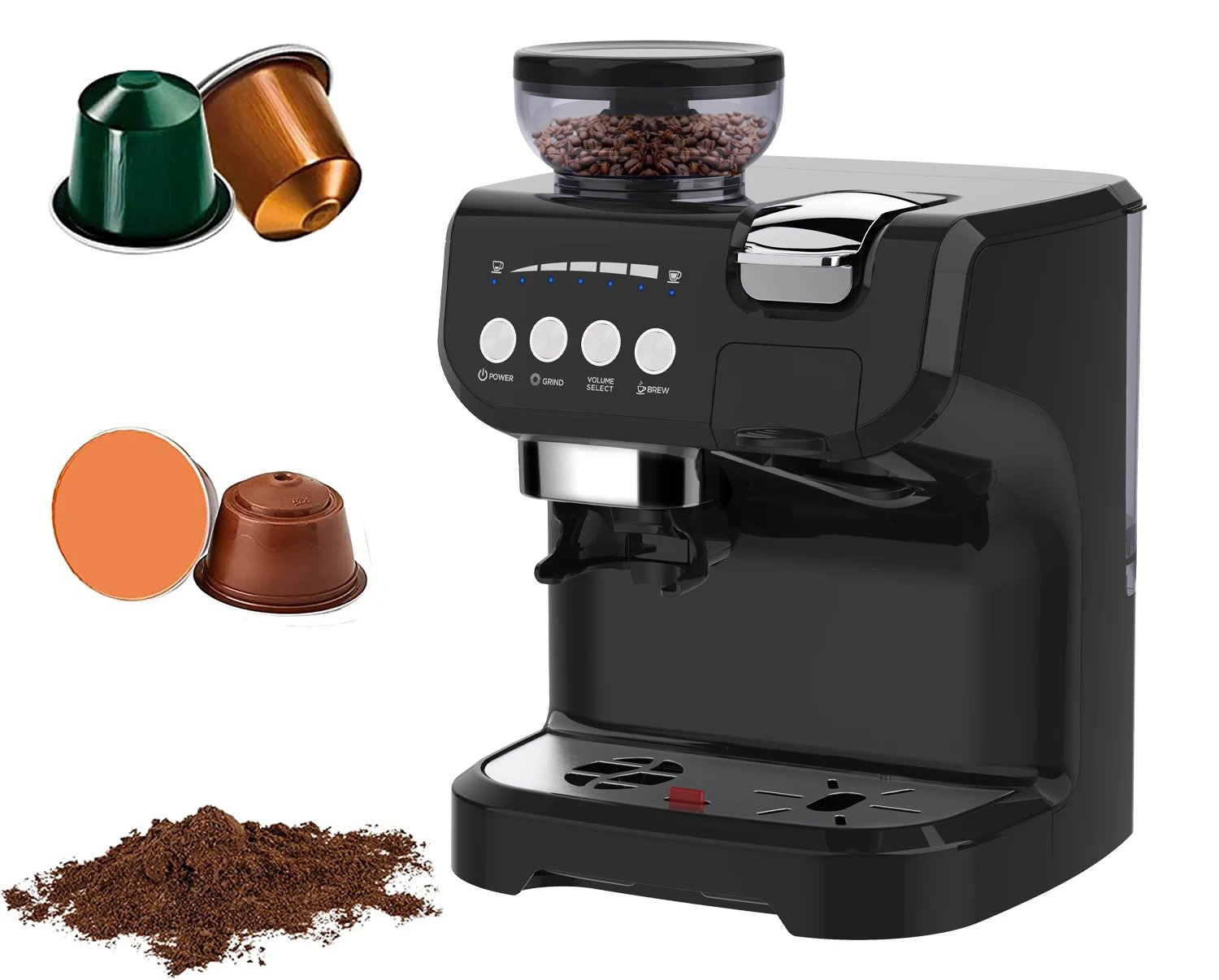 مضخة 19 بار / 7 مستويات لتحضير القهوة / ادخال و اخراج الكبسولات يدويا / متوافقة مع انضمة مختلفة : كبسولات نسبريسو – قهوة المطحونة / مفتاح تحديد مستوى مسحوق القهوة / خزان مياه شفاف قابل للازالة سعة 2لتر / طاقة 1450واط / يستقبل حامل مسحوق القهوة الطازج من وحدة الطحن / يمكن تحديد مستوى الطحن / يمكن تحديد مستوى تخمير القهوة في الكوب / قوة طحن القهوة 110 واط