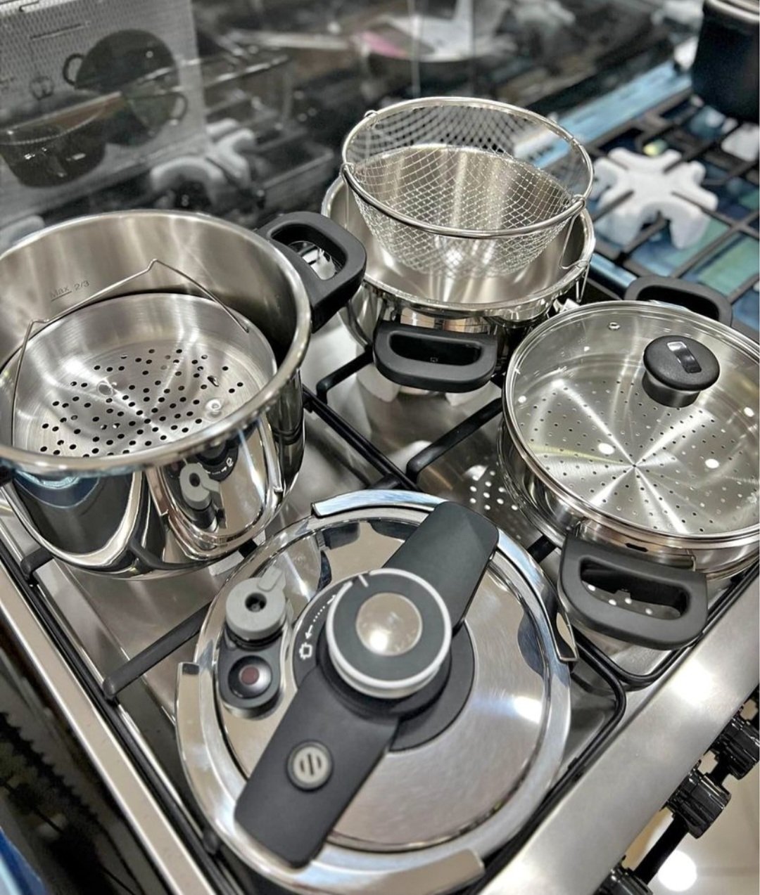 plus de 2000 pièces en acier inoxydable, en céramique et en granit, des casseroles, des poêles à frire, des théières, des cafetières, des marmites à pâtes, des marmites peu profondes, les restaurants et les cafés. Ces produits sont disponibles pour tous les appareils de cuisson comme l’induction, le gaz, le verre et l’halogène. Cuisinez avec moins d’eau et moins d’huile, pour éviter de perdre des vitamines, des minéraux et du goût.