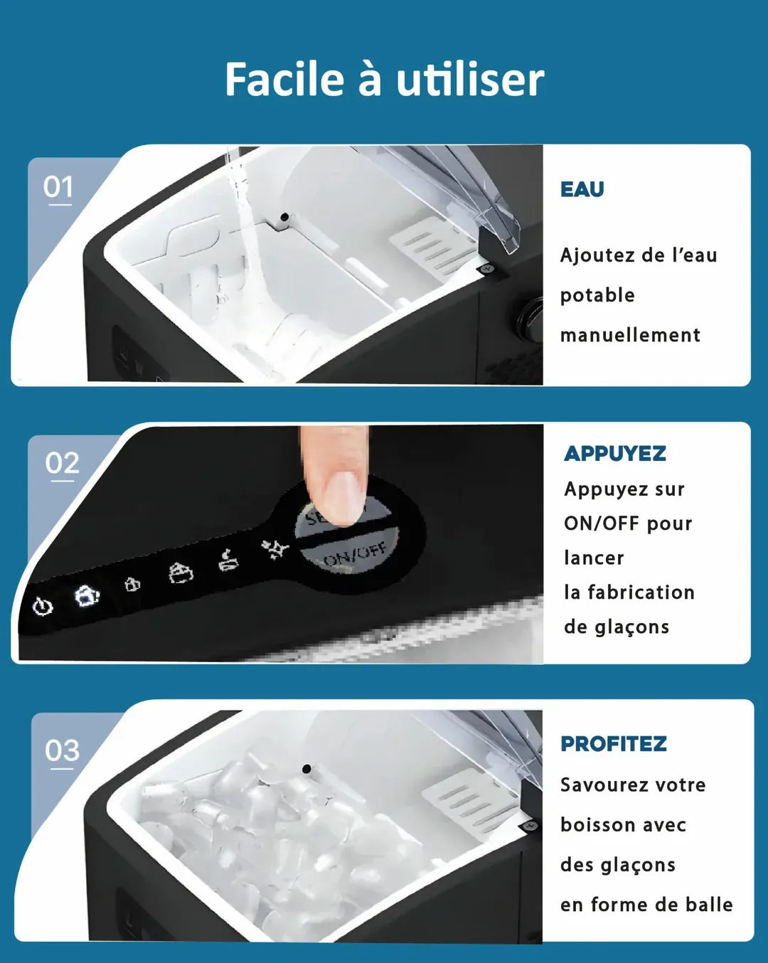 Simple à utiliser, elle vous permet de choisir entre petits et grands glaçons pour toutes vos boissons.