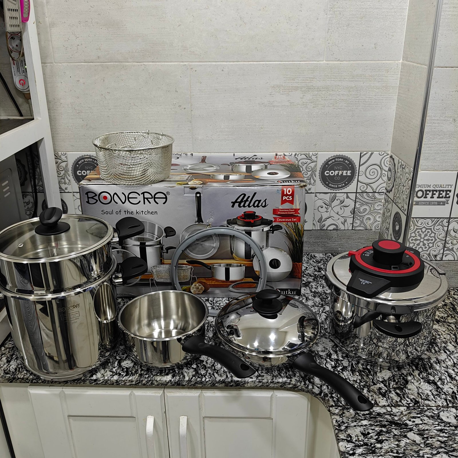 طقم كوكوطة 10 قطع إنوكس من العلامة التركية بونيرا الأصلية 🤩 يتكون من كوكوطة 8 لتر + كوكوطة 6 لتر + كسرونة + مقلاة ( صوتوز ) + كسكاس + شباك فريتوز 💯 بالإضافة إلى غطاء زجاجي و غطاء إنوكس و جوان إضافي