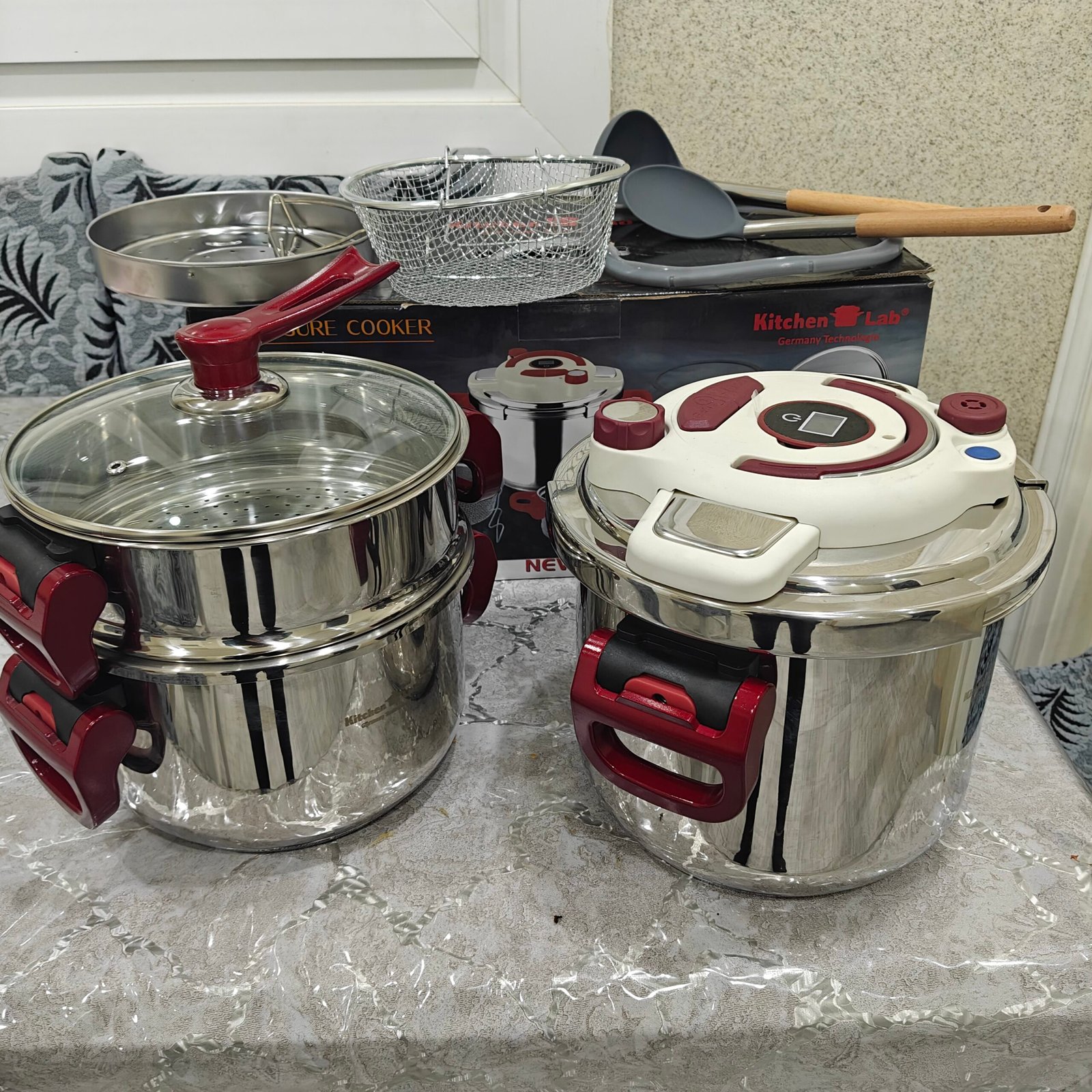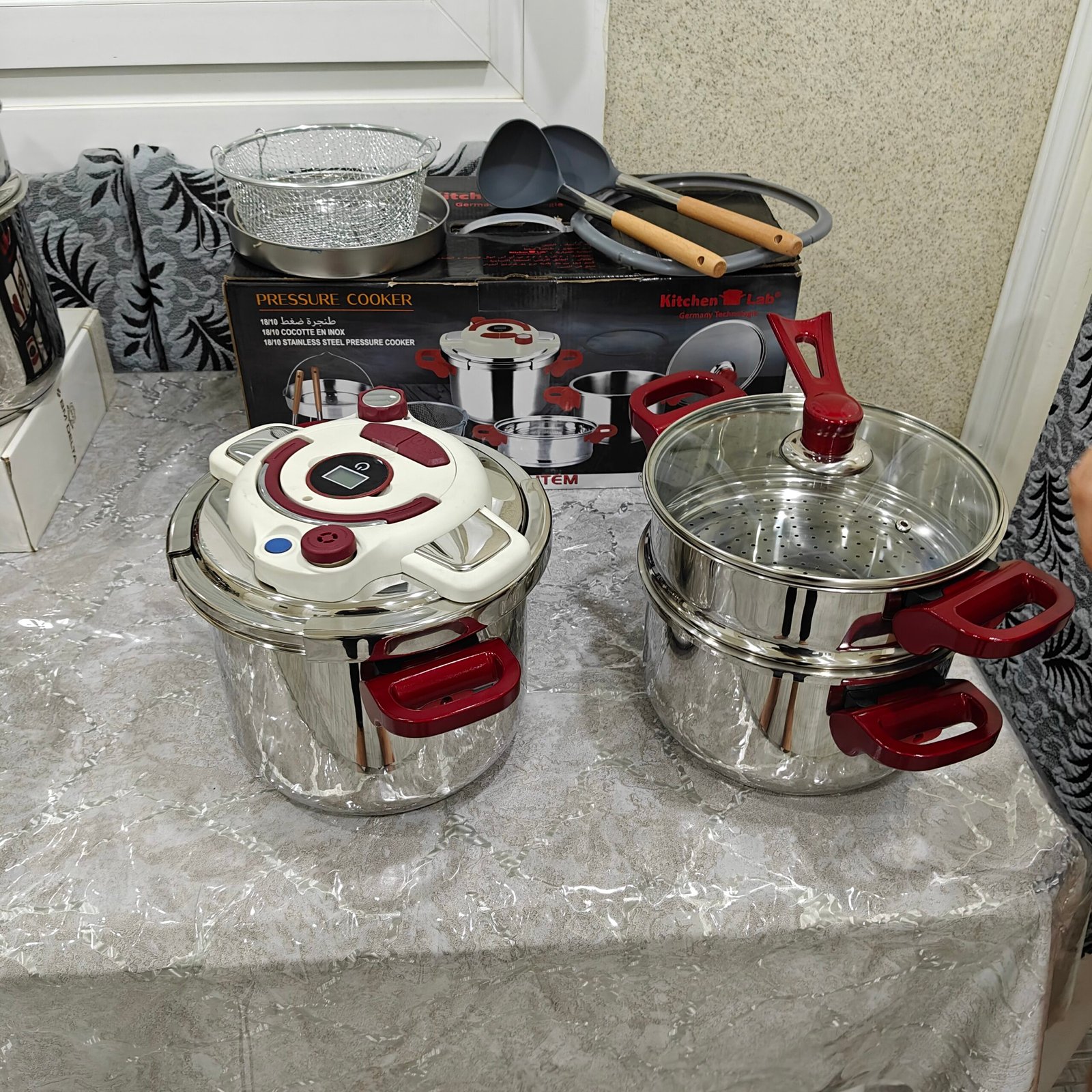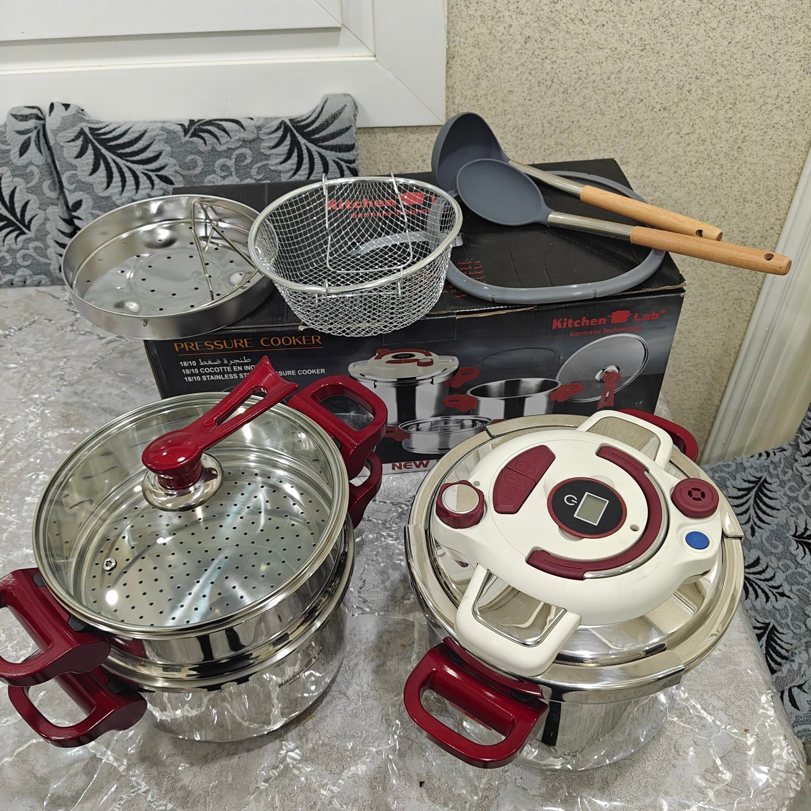 طقم 11 قطعة إنوكس أصلي من شركة كيتشنلاب الألمانية متعددة الإستعمالات تحتوي على كوكوطة 7 لتر و كوكوطة 5 لتر و كوسكوسيي + 2 مغارف سيليكون + شباك فريتوز + فوارة خضر + مؤقت للتنبيه ( مينيتور ) + غطاء زجاجي + جوان إضافي 💯 و مزودة بمقابض قابلة للطي 😍 ثقيلة و مصنوعة بإنوكس عالي الجودة 18/10 مڨريفيا ماللتحت و فيها سنتين ضمان