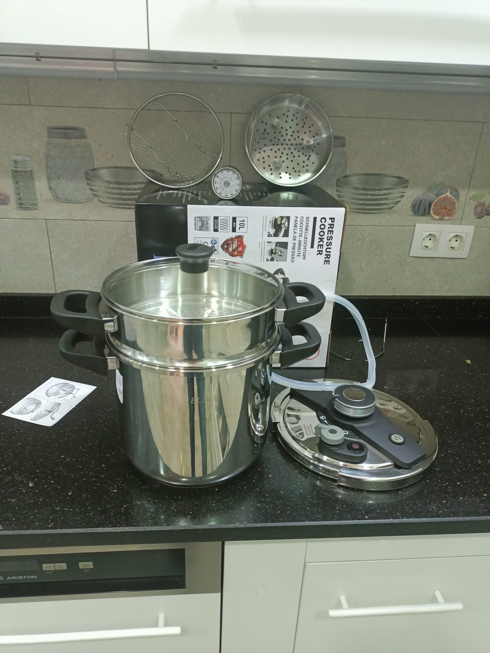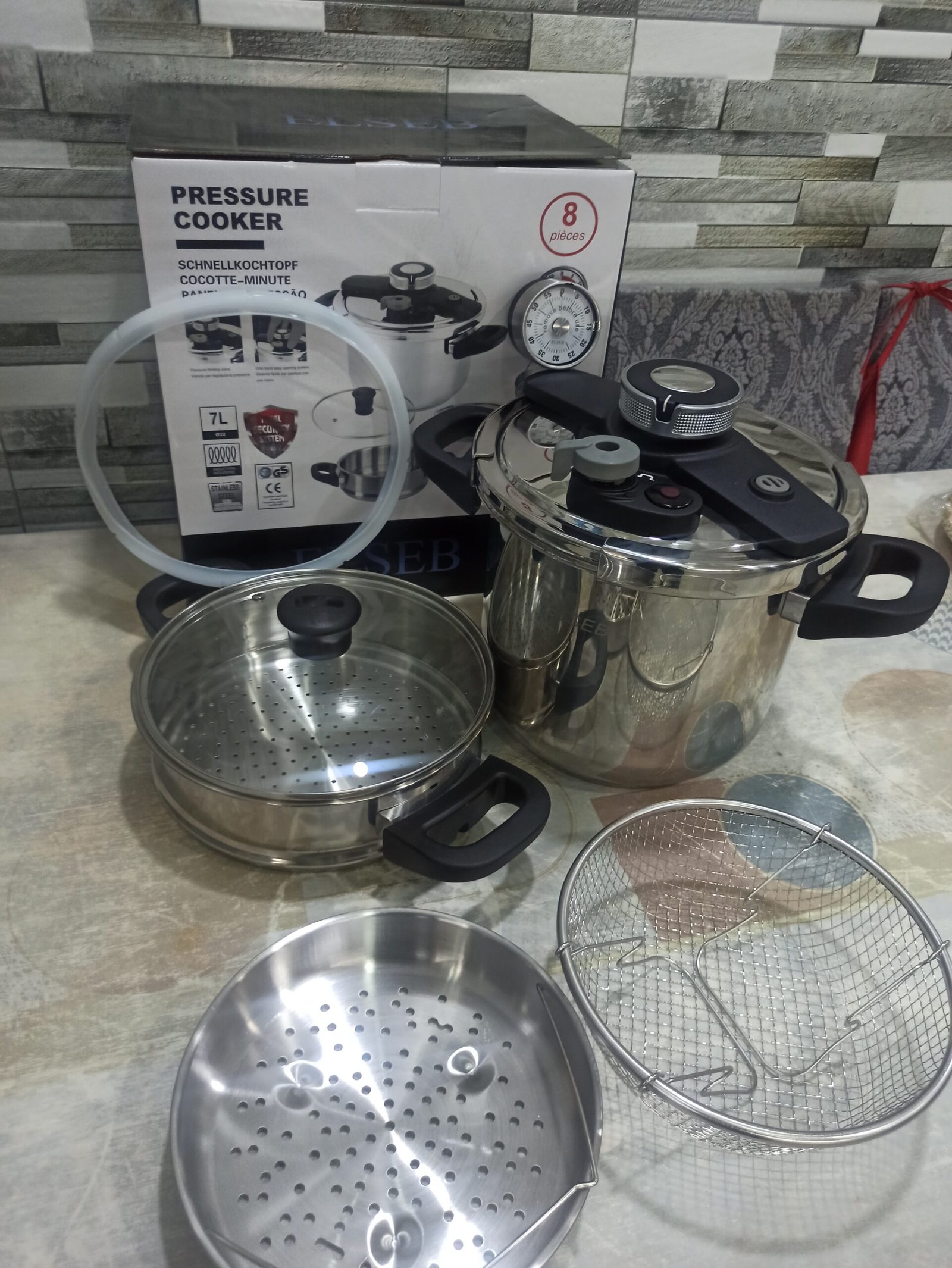 Pack Cocotte ELSEB 8 pièces disponible en plusieurs dimensions ( 5 litres – 7 litres – 8litres – 10litres ) contient Cocotte + Couscousier + panier a vapeur + friteuse + minuteur mécanique+ double joint + couvercle en verre 🔥 avec des poignées anti-chaleur ♥️ inox 18/10 haute qualité griffé et certifier