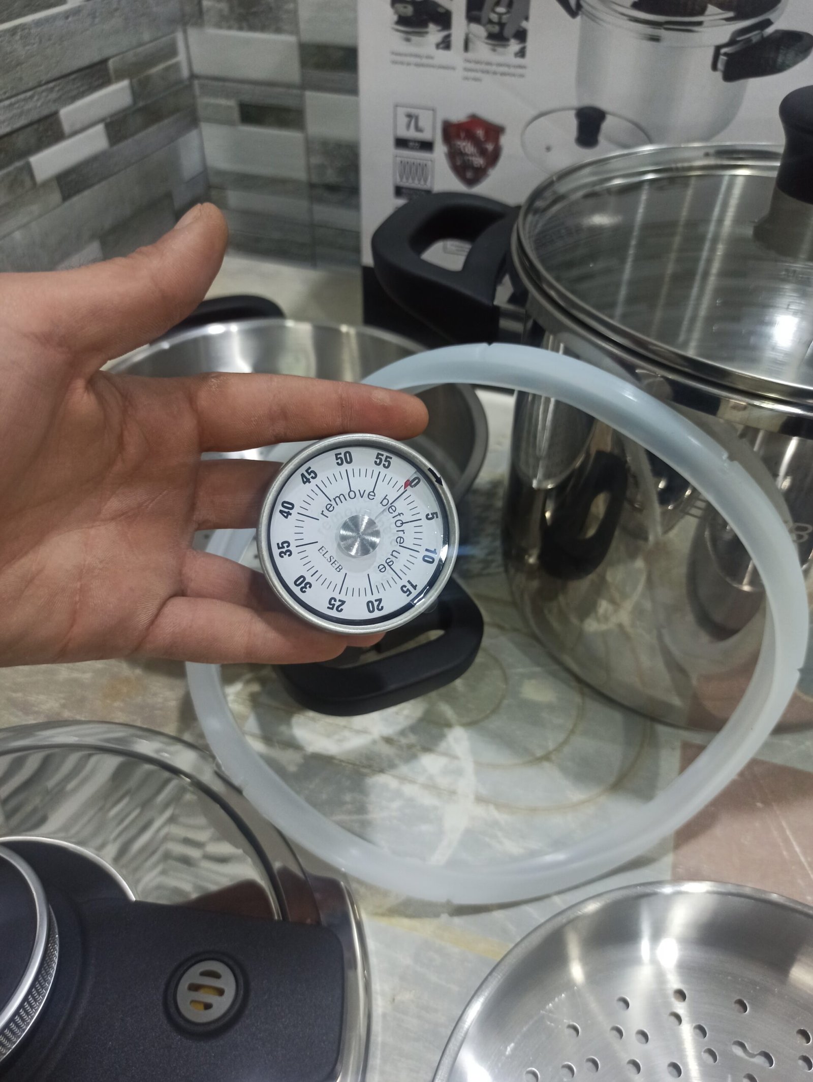 طقم كوكوط 8 قطع ELSEB متوفر بعدة احجام 😍 ( 5لتر-7لتر-8لتر-10لتر ) فيه كوكوطة + كوسكوسيي + فوارة خضر + فريتوز + مؤقت للتنبيه ( minuteur ) + عازل إضافي ( joint Cocotte ) + غطاء زجاجي 🔥و مزودة بمقابض عازلة الحرارة ♥️ ثقيلة و مصنوعة بإنوكس عالي الجودة 18/10 و مڨريفيا ماللتحت