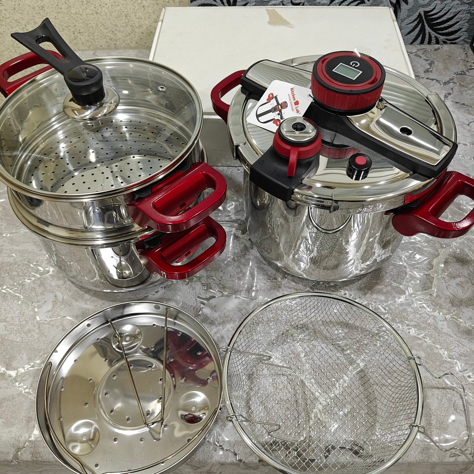 Pack cocotte minutes KitchenLab 7 pieces contient cocotte 7 litre + cocotte 5 litre + couscousier + friteuse + panier a vapeur pour légumes + couvercle en verre 🔥 avec des poignées rabattable ♥️ inox 18/10 haute qualité griffé et certifier 💯