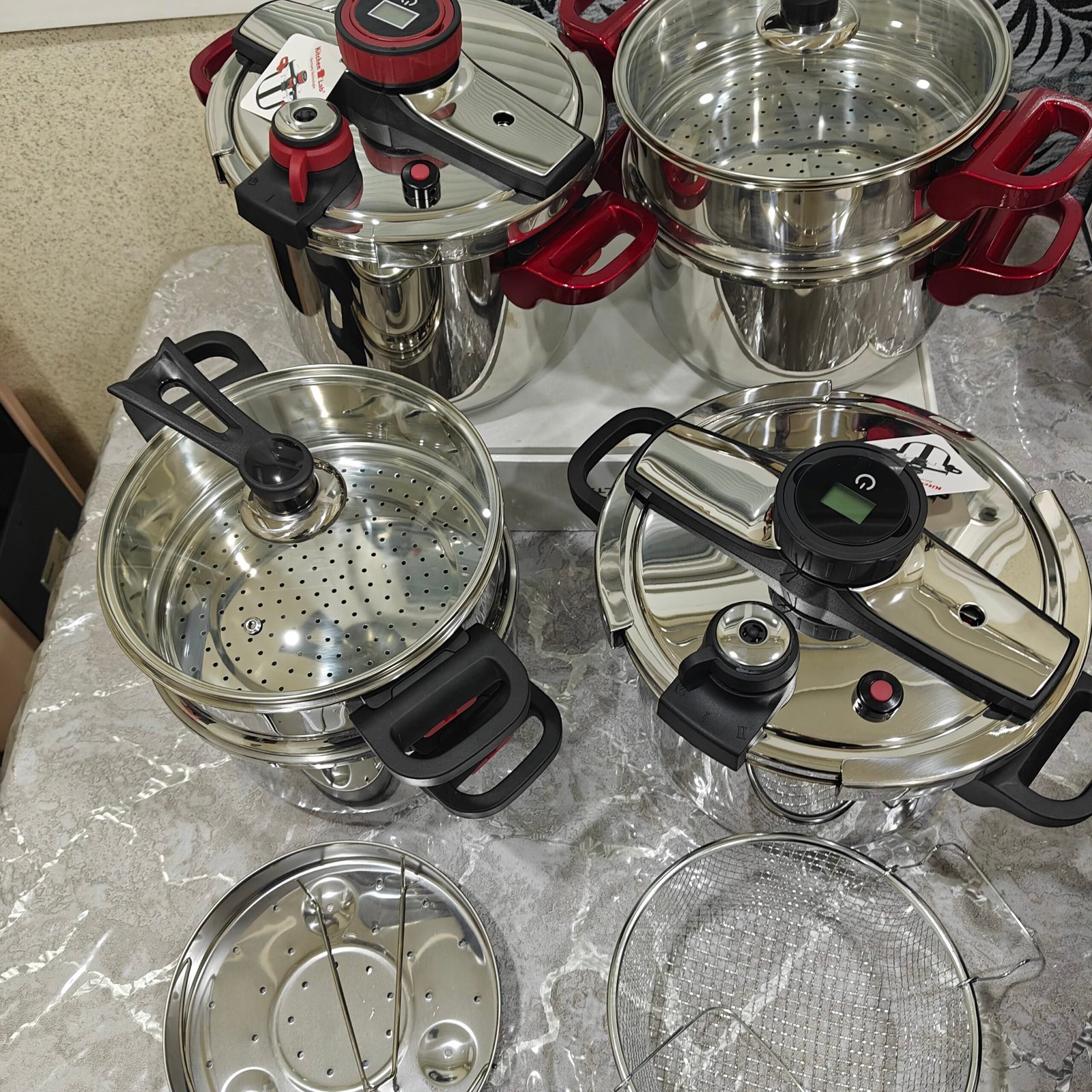 طقم كوكوط مينوت 7 قطع متعددة الإستعمال من الماركة الألمانية كيتشنلاب 💯 فيه كوكوطة كبيرة 7 لتر و كوكوطة صغيرة 5 لتر و كوسكوسيي + شباك فريتوز + فوارة خضر + غطاء زجاجي ♥️ و مزودة بمقابض قابلة للطي 😍 ثقيلة و مصنوعة بإنوكس عالي الجودة 18/10 مڨريفيا ماللتحت و فيها سنتين ضمان 👈 متوفرة باللون الأحمر و الأسود